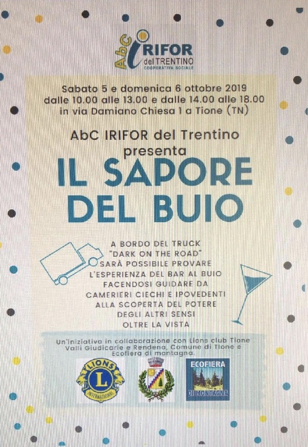 Il bar al buio è l’occasione per conoscere la disabilità visiva con i suoi limiti ma anche le sue risorse, per riscoprire il potere degli altri sensi e per amplificare e valorizzare le proprietà dei prodotti della tradizione enogastronomica sia trentina che nazionale, serviti a bordo.