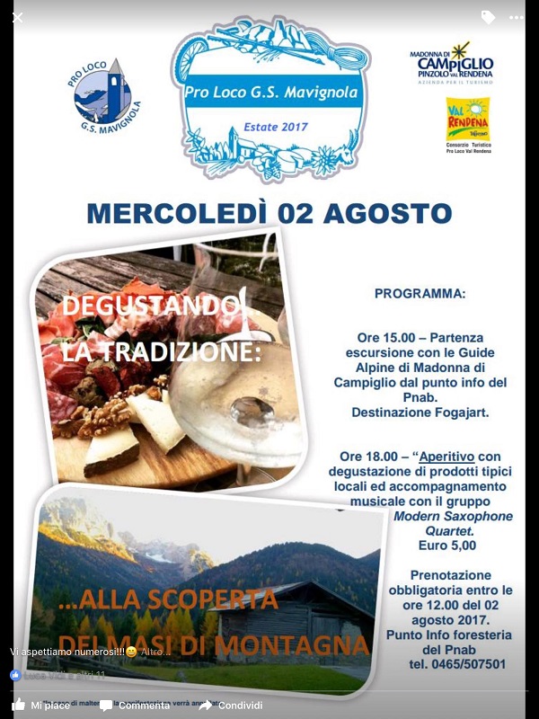 Alle 18.00 nella splendida cornice di una delle più belle postazioni panoramiche del Gruppo di Brenta (i masi di Fogajard sono un balcone naturale ai piedi delle cime più famose d’Europa), l’esibizione del gruppo musicale MODERN SAXOFONE e contestualmente verrà servito un aperitivo con degustazione di prodotti tipici locali.