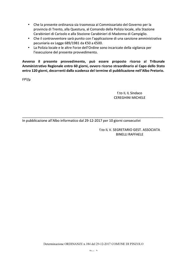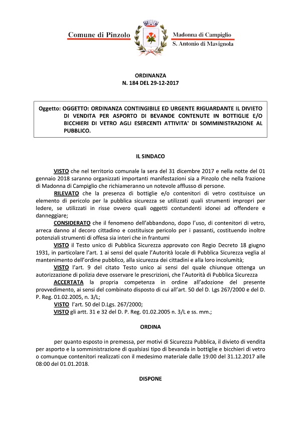 In allegato ordinanza del Sindaco di Pinzolo di divieto, rivolto agli esercenti attività di somministrazione al pubblico, di vendita per asporto di bevande contenute in bottiglie, bicchieri o contenitori di vetro dalle 19.00 del 31 dicembre 2017 alle 8.00 del 1° gennaio 2018.