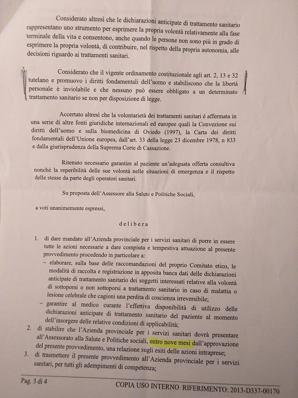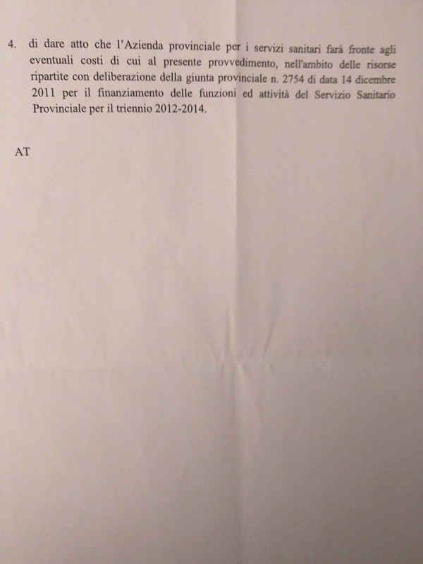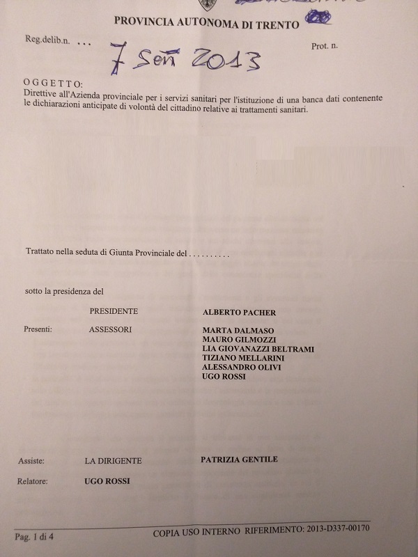 Nonostante la delibera di Giunta, promossa dall’associazione Laici Trentini per i diritti civili ma vetusta di ben quattro anni, la quale ha dato mandato all’azienda provinciale per i servizi sanitari, il 7 settembre 2013 , di predisporre entro nove mesi ” le modalità di raccolta e registrazione in apposita banca dati delle dichiarazioni anticipate di trattamento sanitario relative alla volontà di sottoporsi a trattamento sanitario in caso di malattia o lesione cerebrale che cagioni una perdita di conoscenza ” , la stessa azienda sanitaria ad oggi si è resa clamorosamente latitante.