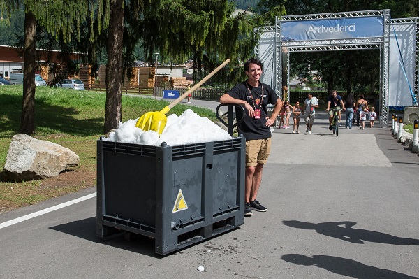 Tutti i giorni, una volta al mattino e una al pomeriggio, infatti, Nicola Scuri, uno dei volontari della squadra di supporto alla gestione e cura dello stadio Pineta, ha il compito di portare negli spogliatoi dell’As Roma un “carretto” di neve prodotta appositamente nel vicino Stadio del Ghiaccio. Si tratta di oltre un metro cubo che, in questa occasione, non serve per preparare una pista da sci, ma per raffreddare le vasche d’acqua utilizzate dai giocatori per rinfrescare i muscoli nel post allenamento.