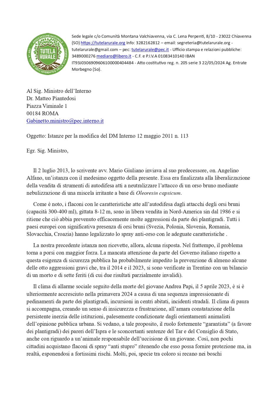 L’Associazione Nazionale per la Tutela dell’Ambiente e della Vita Rurali, per mezzo del suo legale avv. Mario Giuliano, ha inviato una istanza al ministro dell’Interno Matteo Piantedosi per la modifica del DM Interno 12 maggio 2011 n. 113, finalizzata alla liberalizzazione della vendita di strumenti di autodifesa atti a neutralizzare l’attacco di orso bruno mediante nebulizzazione di una miscela irritante a base di Oleoresin capsicum, in pratica l’estratto naturale di peperoncino. Da notare che lo stesso avvocato il 2 luglio 2013 inviò al suo predecessore, on. Angelino Alfano, un’istanza con il medesimo oggetto della presente. Sta ancora aspettando la risposta.