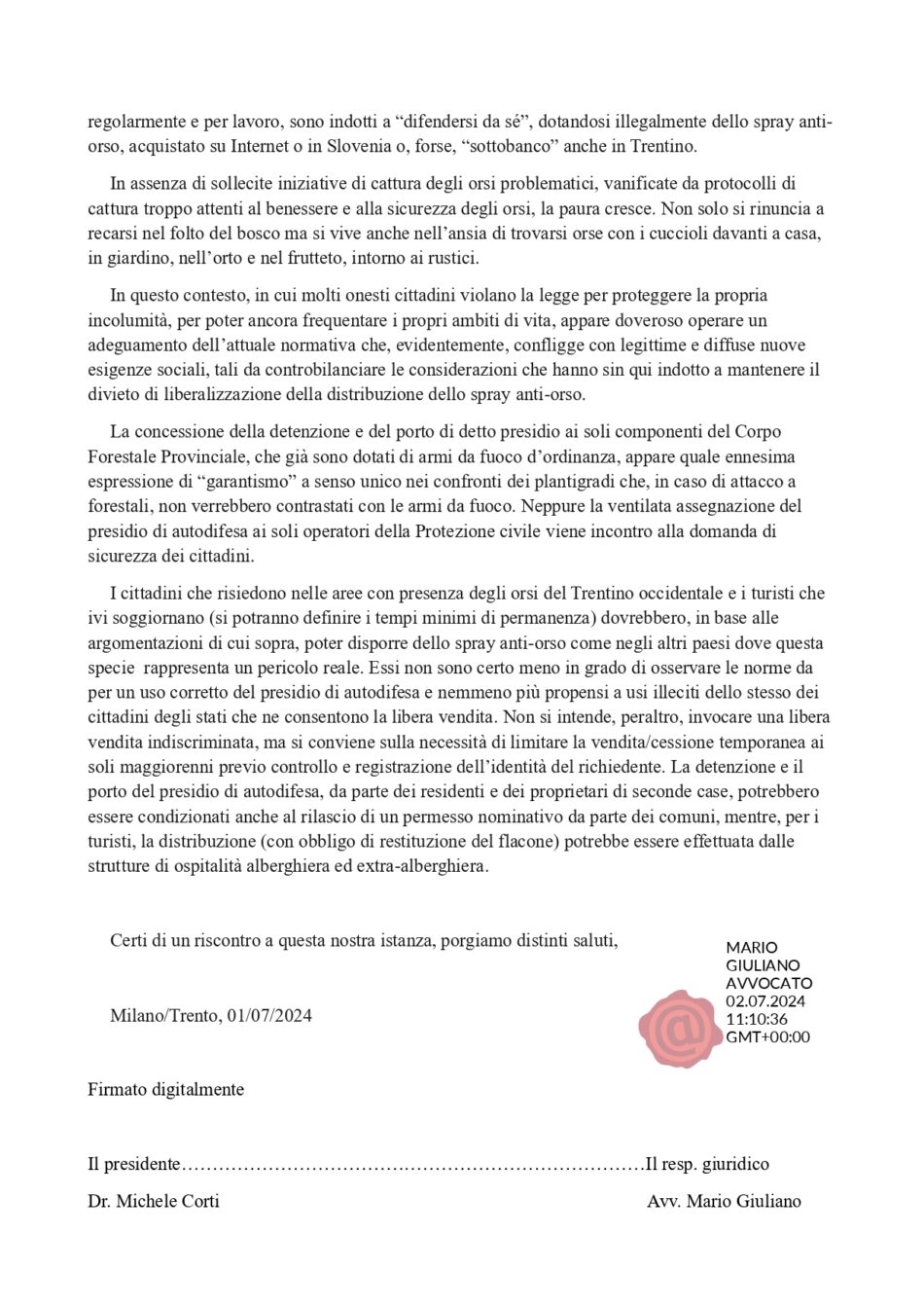 Com’è noto, i flaconi con le caratteristiche atte all’autodifesa dagli attacchi degli orsi bruni (capacità 300-400 ml, con gittata 8-12 m), sono in libera vendita in Nord America sin dal 1986 e hanno prevenuto efficacemente molte loro aggressioni. Tutti i Paesi europei con significativa presenza di orsi (Svezia, Polonia, Slovenia, Romania, Slovacchia, Croazia) hanno legalizzato lo spray anti orso con le adeguate caratteristiche. Molti, poi, specie tra coloro si recano nei boschi regolarmente e per lavoro, sono indotti a difendersi da sé, dotandosi illegalmente dello spray anti orso, acquistato su Internet o in Slovenia o, forse, sottobanco anche in Trentino. La mancata attenzione da parte del Governo italiano rispetto a questa esigenza di sicurezza pubblica ha probabilmente impedito la prevenzione di almeno alcune delle otto aggressioni gravi che, tra il 2014 e il 2023, si sono verificate in Trentino con un bilancio di un morto e di sette feriti (di cui due risultati parzialmente invalidi).