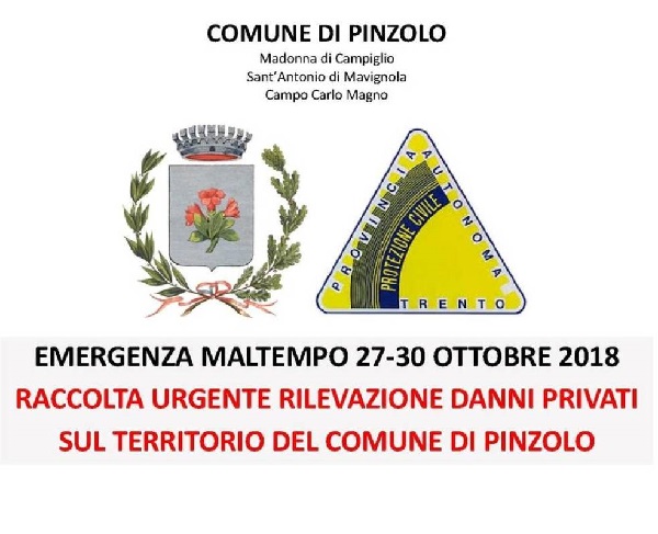 L’Amministrazione comunale invita i cittadini che hanno subito danni a beni immobili e veicoli a seguito dell’emergenza maltempo del 27-30 ottobre u.s. a prendere visione della nota del Sindaco prot. 14733 di data 14.11.2018 ed a compilare l’apposita scheda di valutazione danni, seguendo le relative istruzioni.