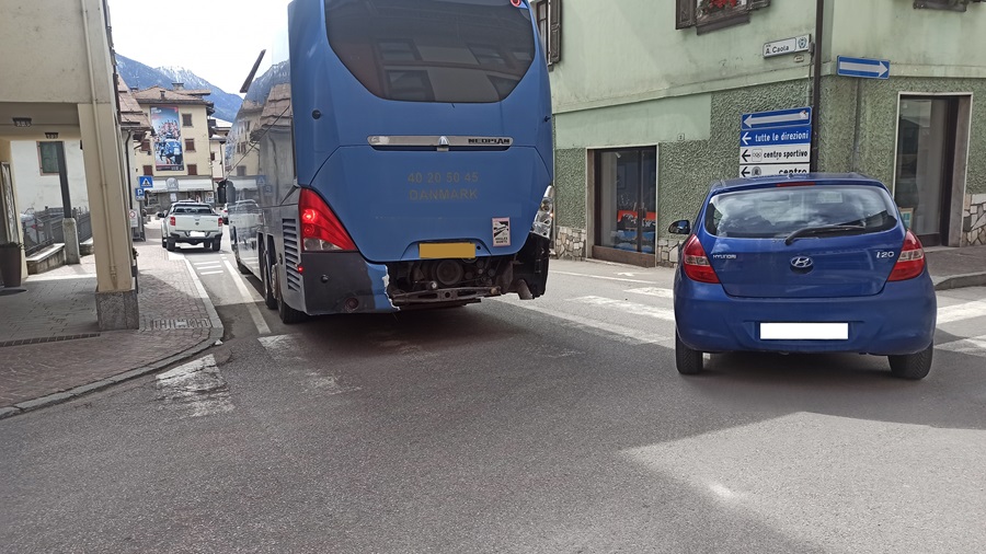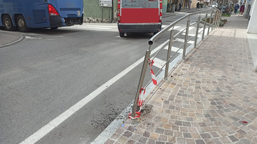 Intorno a mezzogiorno di oggi, domenica 24 marzo, un autobus di turisti stranieri ha urtato (ormai siamo almeno al terzo incidente in quattro mesi) ha urtato contro la ringhiera che nell’autunno scorso è stata posizionata all’entrata della Cassa Rurale di Pinzolo. Nonostante si stata accorciata (dai precedenti urti) di più di un metro, il grosso mezzo ha urtato con la parte posteriore procurando un notevole danno al mezzo. Lo sconsolato autista danese non ha potuto fare altro che fermare il mezzo, raccogliere i pezzi e rimettersi in viaggio senza il paraurti posteriore e senza il gruppo ottico posteriore.