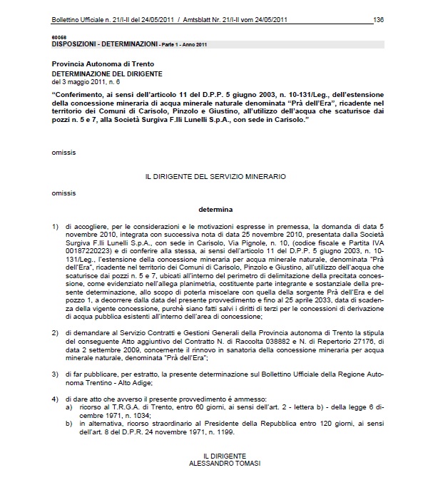Riporto una notizia apparsa sui quotidiani locali nel mese di maggio, relativa all’estensione della concessione all’utilizzo di acqua di altre sorgenti, su domanda della Società Surgiva. In pochi mesi la nostra efficiente Provincia Autonoma di Trento ha dato parere positivo fissando la scadenza anche di questa concessione il 25 aprile 2033 !!!