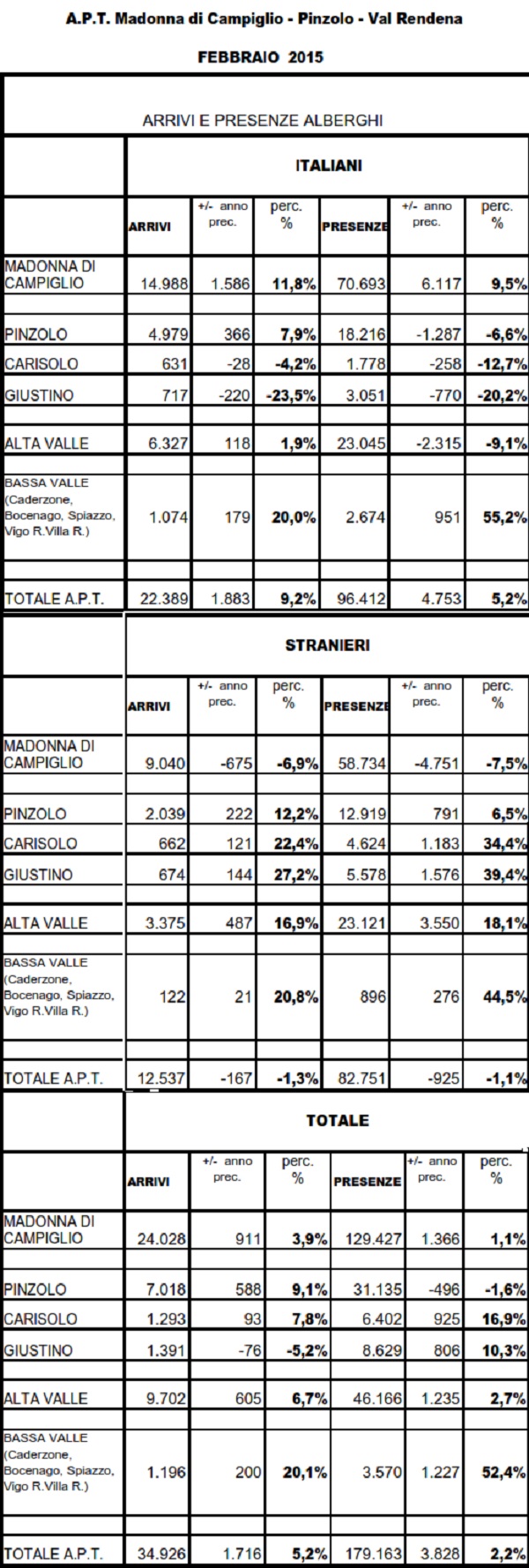 Febbraio 2015 – Arrivi e presenze alberghi Apt CampiglioPinzolo