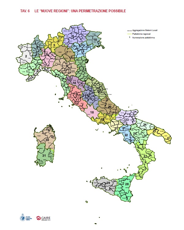 Le considerazioni qui riportate riflettono un percorso che la Società Geografica Italiana, la più antica istituzione di ricerca territoriale del Paese, persegue da anni. Nel periodo più recente – in particolare in seguito all’emanazione del Disegno di Legge Costituzionale del 30 luglio 2013 – si sono concretizzate in una proposta esplicita di riordino territoriale. Nello specifico, il testo che segue è strutturato nel modo seguente: