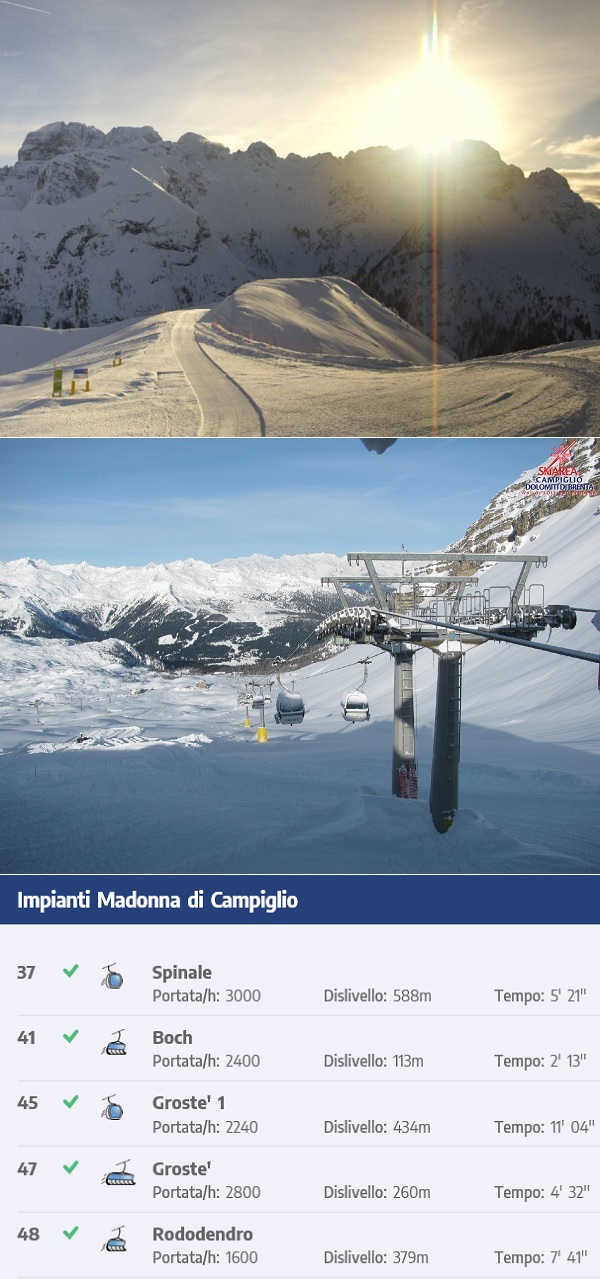 Finalmente splende il sole sulla Skiarea Campiglio. Dopo giorni di nuvole, pioggia e neve, da stamattina è tornato il bel tempo. Nei due week-end di novembre sono stati messi in funzione alcuni impianti nella zona Grostè e, da oggi, a Madonna di Campiglio le funivie saranno aperte tutti i giorni. Fino a venerdì soltano 5 impianti nella zona Grostè-Spinale ma da sabato 30 l’apertura sarà completa. E da giovedì 5 dicembre l’intera skiarea sarà a disposizione degli sciatori, compresi i collegamenti con Pinzolo e Folgarida-Marilleva. Ottimo l’innevamento: si va dal mezzo metro di Pra Rodont ai due metri e mezzo del Grostè. Insomma, un inizio di stagione che non si vedeva da moltissimi anni.