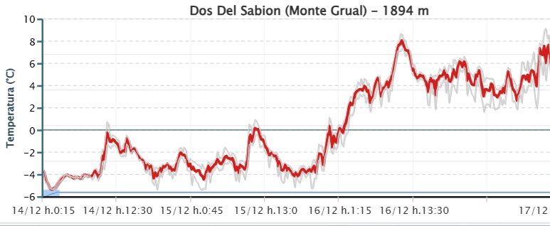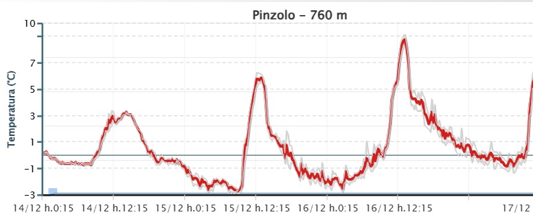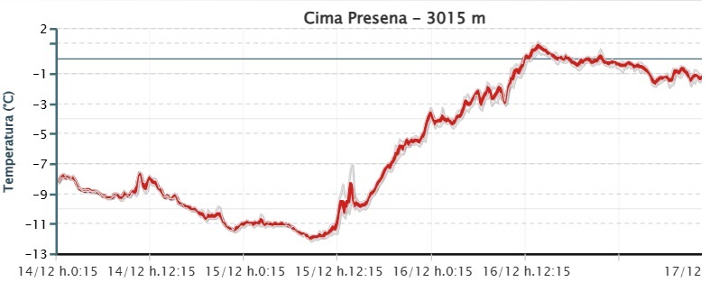 Ecco il confronto delle temperature rilevate a Cima Presena (3015 m), Pinzolo e Monte Grual da sabato 14 dicembre alla mattinata di oggi, 17 dicembre: