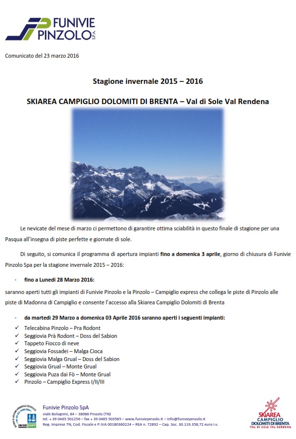 • Funivie Pinzolo – Comunicato del 23 marzo 2016
