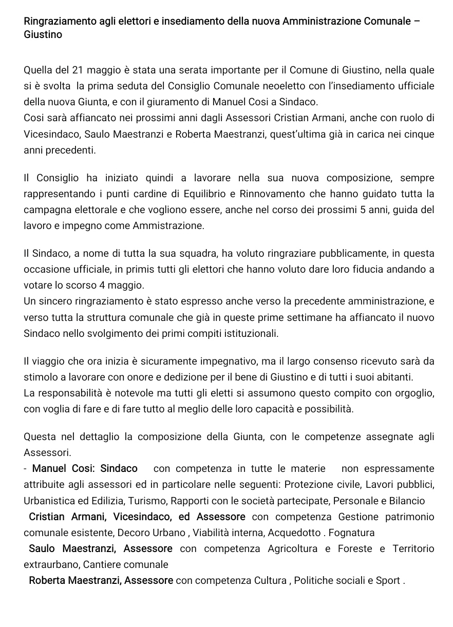 Giustino: Ringraziamento agli elettori e insediamento della nuova Amministrazione comunale