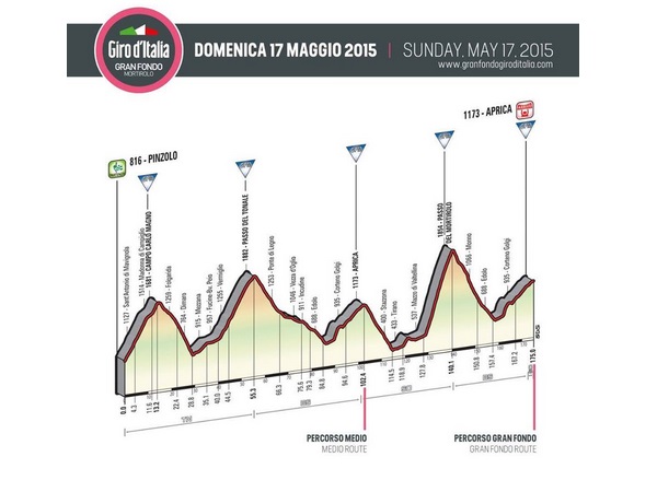 Il conto alla rovescia è cominciato. Domenica 17 maggio gli amatori iscritti alla GRAN FONDO GIRO D’ITALIA testeranno per i professionisti la tappa Regina del Giro d’Italia 2015: la Pinzolo – Aprica. Due i percorsi a loro disposizione: accanto al percorso di tappa, il Gran Fondo da 175 km con la scalata al leggendario Passo del Mortirolo, ci sarà anche il Medio di 102 km che si concluderà al primo passaggio ad Aprica, per i meno allenati.