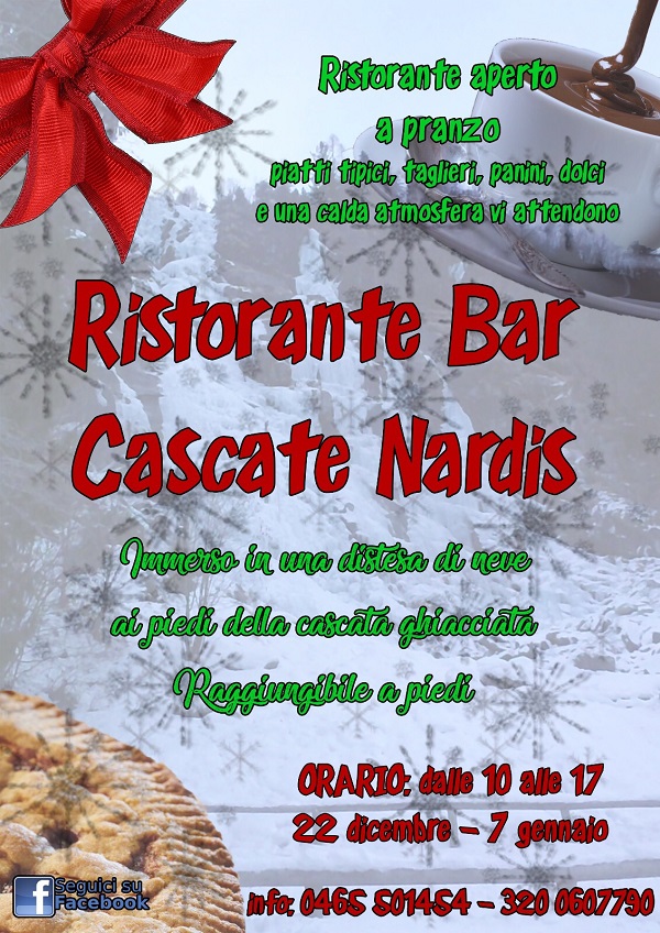 Il bar ristorante Cascate nardis sarà aperto fino al 7 gennaio sia come bar sia come ristorante per poter offrire ai turisti che vorranno ammirare la bellezza delle cascate ghiacciate e della val Genova in inverno un punto di ristoro.