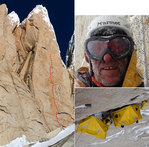 Partiamo il 14 ottobre e la sera dopo siamo al Chalten. Una giornata di preparativi e acquisti vari e il giorno dopo siamo alla Piedra del Fraile, ultimo campo nella vegetazione. Arriviamo prima delle 12 e un’ora dopo siamo già al primo carico fino al ghiacciaio del Piergiorgio. Nei giorni successivi riusciamo a portare tutto al Passo Marconi, proprio sullo Hielo Continental. Sono carichi e camminate che ci richiedono molto ma allo stesso tempo ci danno le prime soddisfazioni. Poi tutto sulle nostre slitte. Slitte semplici ma super-scivolose. Il tragitto non è breve ma con gli sci e i nostri "bobi" al guinzaglio in poche ore siamo al Circulo de los Altares. Un posto che io conoscevo già ma che ogni volta mi fa provare emozioni incredibili. Anche i miei compagni sono affascinati dal luogo. Una sorpresa non piacevole quando arriviamo al "Filo Rosso". C’è veramente poca neve quest’anno e iniziamo a scavare per costruire la nostra truna ma subito troviamo ghiaccio. Cambiamo posto più volte finché in qualche modo riusciamo a farci la nostra "casa bianca". Un giorno lo passiamo qui a metterci a posto e preparare la roba per la parete e nel pomeriggio facciamo un giretto verso la parete per vedere dove passare sul ghiacciaio. Poi via… Altri trasporti e iniziamo a salire e portare su tutto oltre lo zoccolo, proprio dove la parete si fa verticale. Poi iniziamo a scalare davvero. Sulle tracce di Sarchi, Nadali e Dal Prà. Ripenso a loro e a quell’anno. Penso ad Andrea che voleva venire con me ma poi, onestamente, mi ha detto che non se la sentiva più di fare quelle "strapaciadi" (strapazzate). Tomas e Francesco sono delle rocce. A trasportare i sacconi pesanti e ad arrampicare. Mai un lamento. E così, un tiro dopo l’altro, un saccone via l’altro, una jumarata dopo l’altra, una folata di vento seguita da una più forte. Una nevicata dopo l’altra. Seracchi che cadono, ghiacciaio molto crepacciato, scariche ogni momento. Un tiro duro e poi un altro ancor più difficile, faticoso, a volte da panico e sempre il venticello che ti sbatte le neve in faccia. Ma quanto è in piedi ‘sta parete, ma quanto è bella, affascinante anche se a volte da panico. Una notte dopo l’altra nelle nostre porta-ledge. Poi il trasloco 200 metri più sopra. Un altro tiro. Un sacco di parolacce mentre le mani si gelano. I sacchi a pelo bagnati. Se fosse bel tempo. E recuperare i sacconi. E anche quello pieno di neve. 11 giorni in parete. Poco più di due giorni di sole, se così si può dire. Il tempo fa sempre schifo. Non ne possiamo più. Allora decidiamo a fatica di mollare. Bisogna salire nel nostro punto più alto a recuperare della roba, delle corde per poter scendere. Giornata di lotta col vento che ti sbatte qua e là. Domani scenderemo. Il giorno dopo la discesa non è proprio così semplice. Siamo anche molto carichi e a terra arriviamo poco prima che sia buio. Con le frontali scendiamo sul ghiacciaio. Nuovi buchi che ci obbligano a giri viziosi. C’è un sacco di neve fresca. Quanta… non riusciamo a capire. Poi, poco prima di mezzanotte, siamo da Noaa, la nostra guardiana-amica. Verso le 3 finalmente nei sacchi. Bagnati… ma qui siamo a casa.