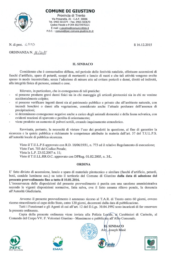 Grazie anche al Sindaco di Giustino per l’ordinanza contro i petardi