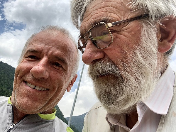 L’altro ieri stavo andando a fare una cosa in Pineta e l’ho incontrato. E’ sempre un uomo in gamba anche se mi dice di avere qualche problemi alle articolazioni. E’ stato anche giornalista per molti anni di un quotidiano trentino. Gli ho detto che avevo iniziato a scrivere questa pagina e gli ho chiesto il permesso di farlo e perché no… fare una foto insieme. Il mio Professore ed è di Pinzolo.