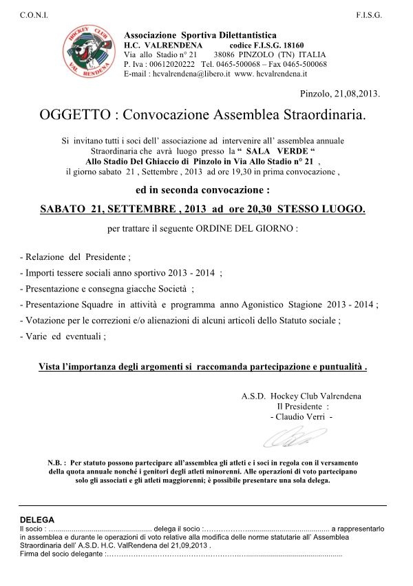 • Hockey Val Rendena – Convocazione Assemblea straordinaria