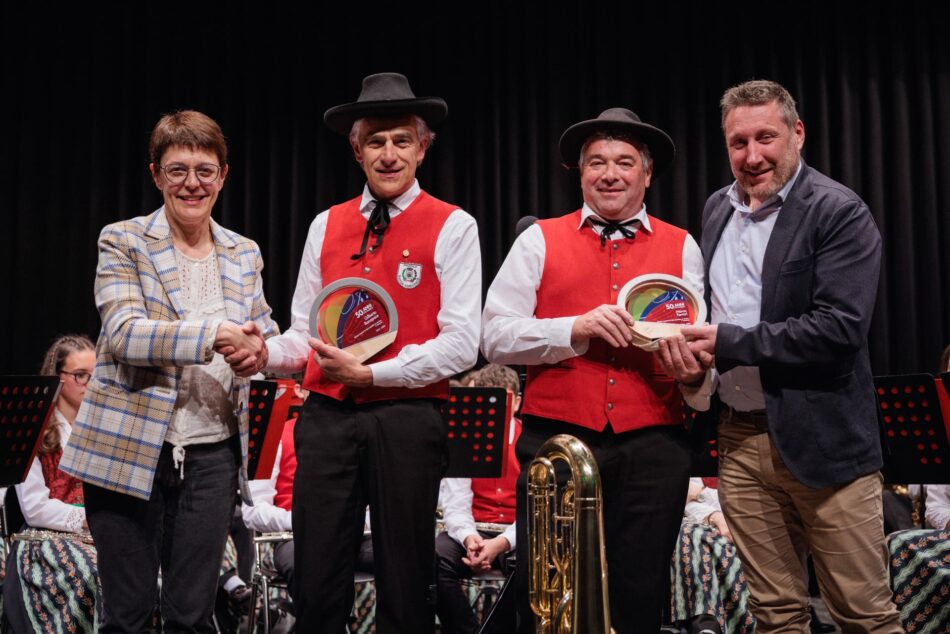 Ciliegina sulla torta: la premiazione di Gilberto Buzin e Marco Gianaral per i loro primi 50 anni all’interno della sodalizio. Riconoscimento introdotto da un simpaticissimo video stile Iene pieno di calore, umorismo, che metteva a confronto in un’intervista doppia i due veterani. Il video oltre che riproporre i due, testimoniava che questa è una banda in tutti i sensi: una banda di amici, una banda di mattacchioni, una banda di persone che attraverso la musica presta il proprio servizio alla comunità, come ha detto la presidente della federazione della bande trentine Cristina Moser.