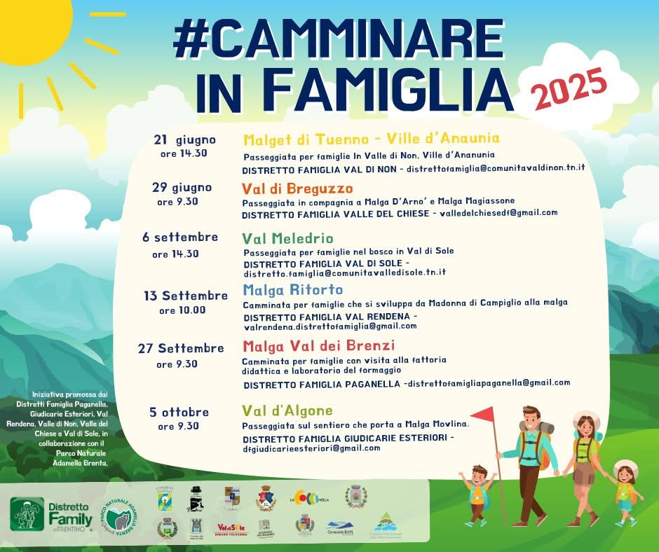 Anche nel 2025 torna “Camminare in Famiglia”, il progetto promosso dai Distretti Famiglia del Trentino con il supporto del Parco Naturale Adamello Brenta e dell’Agenzia per la Coesione Sociale.
