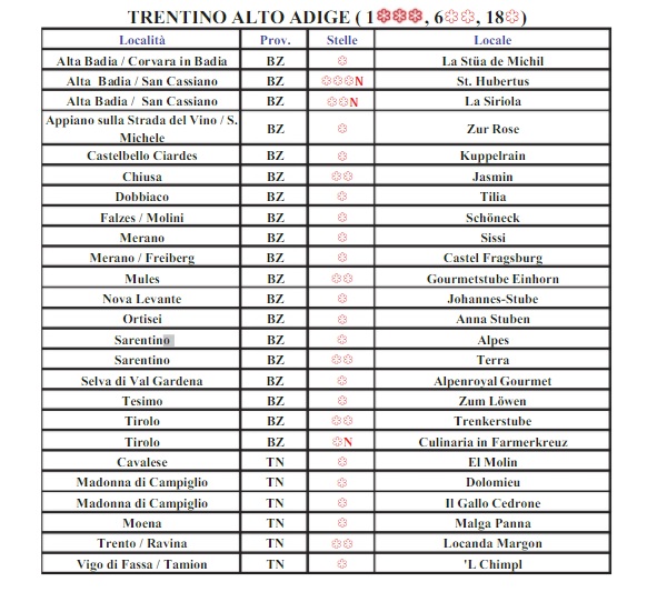 Buona la performace dei ristoranti del regione Trentino-Alto Adige: 1 tre stelle, 6 due stelle e 18 una stella, ma i risultati sono decisamente sproporzionati verso la provincia di Bolzano. Solo 6 i ristoranti stellati in Trentino. Confermano la stella le due élite di Madonna di Campiglio: il Gallo Cedrone e il Dolomieu.