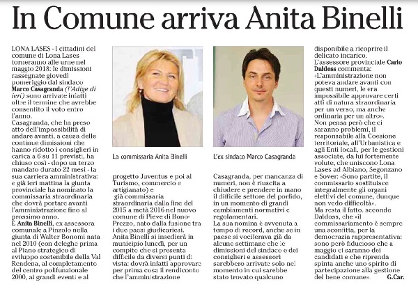 "In Comune arriva Anita Binelli": ecco la notizia riportata da L’Adige di oggi 23 settembre 2017. Il Comune è quello di Lona Lases, dopo le dimissioni del sindaco Marco Casagrande.