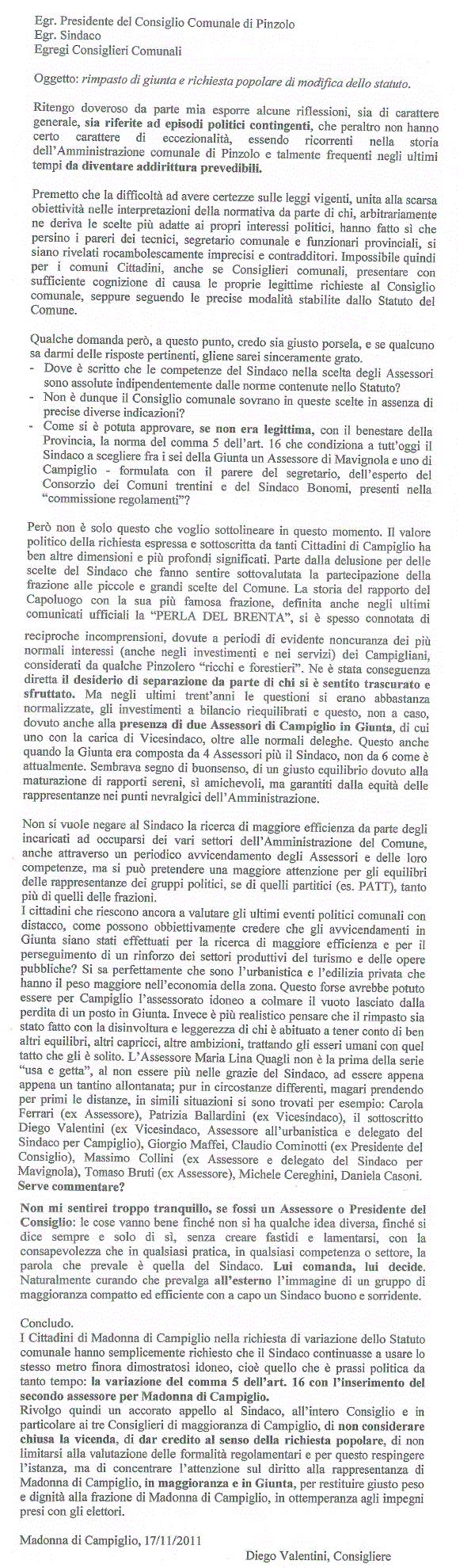 Intervento del Consigliere Diego Valentini sulla Mozione popolare