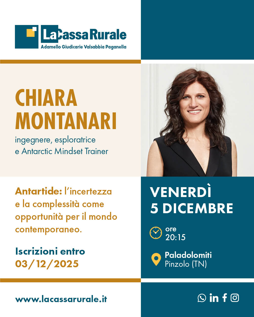Sul palco de La Cassa Live Chiara Montanari porterà l’intervento dal titolo “Antartide: l’incertezza e la complessità come opportunità per il mondo contemporaneo.” e racconterà come l’esperienza in ambienti estremi e la leadership acquisita sul campo l’ha portata a sviluppare il suo “Antarctic Mindset”.