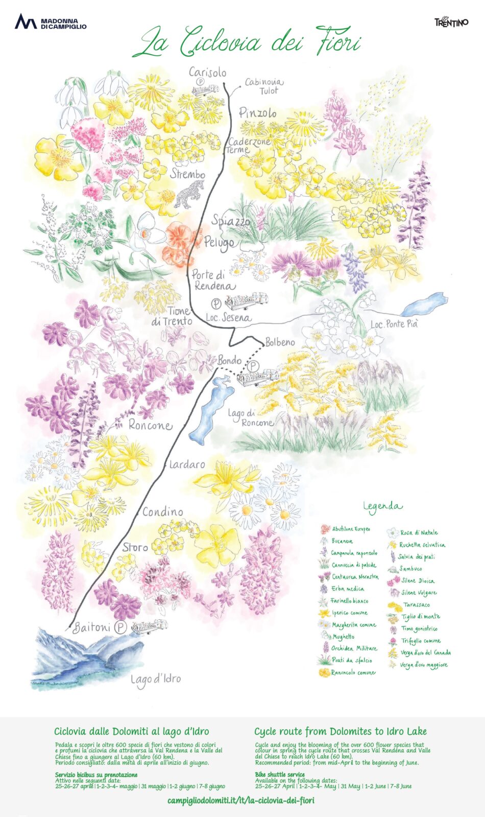 Il percorso collega i 25 km della pista ciclabile della Val Rendena ai 28 km della ciclovia della Valle del Chiese, alternando tratti ciclopedonali a strade a basso traffico, e si arricchisce in questa stagione con oltre 600 specie floreali che impreziosiscono il paesaggio.