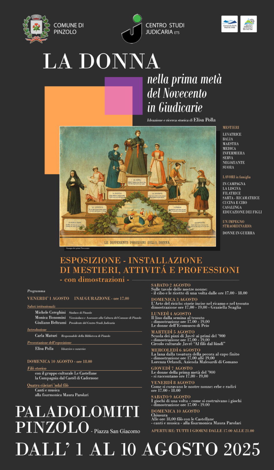 Dal 1° al 10 agosto avrà luogo a Pinzolo presso il Paladolomiti la mostra “La donna nella prima metà del ‘900 in Giudicarie”, promossa dal Centro Studi Judicaria, in collaborazione col comune di Pinzolo (biblioteca).