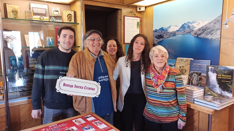 Si è svolta stamattina, martedì 2 aprile 2024, una breve ma toccante cerimonia di consegna della targa “Bottega Storica Trentina” a Danilo Povinelli, titolare insieme alla figlia Cristina della Bottega Foto Ottica Povinelli di Pinzolo. Il prestigioso riconoscimento è stato consegnato nelle mani di Danilo dal Sindaco Michele Cereghini, alla presenza della figlia Cristina, della adorata moglie Ivana e dell’Assessora Laura Rossini. Al breve rinfresco, seguito alle parole di ringraziamento del Sindaco e della moglie Ivana, hanno partecipato anche i nipoti, tanti parenti e alcuni vicini.