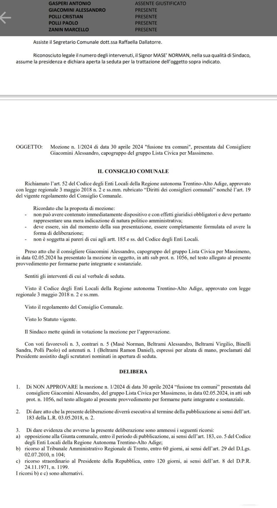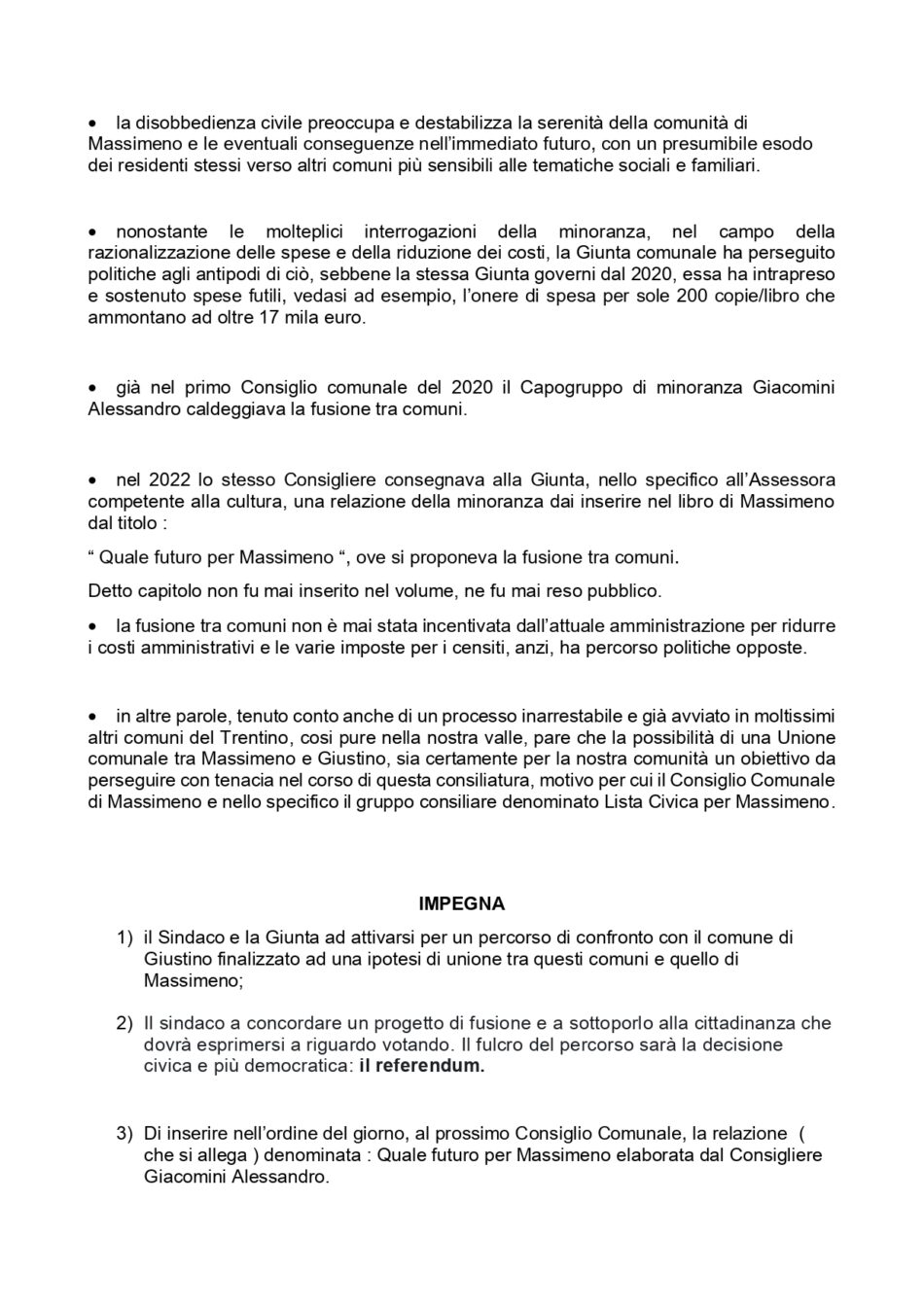 Con la mozione del gruppo di minoranza del 30 aprile 2024 “fusione tra comuni “, se approvata, avrebbe permesso di coinvolgere i cittadini, come più volte richiesto, ad una valutazione per l’avvio di fusione tra il comune limitrofo di Giustino.
