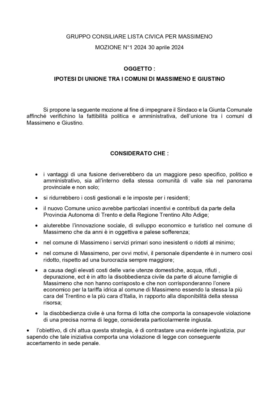 Con la mozione del gruppo di minoranza del 30 aprile 2024 “fusione tra comuni “, se approvata, avrebbe permesso di coinvolgere i cittadini, come più volte richiesto, ad una valutazione per l’avvio di fusione tra il comune limitrofo di Giustino.