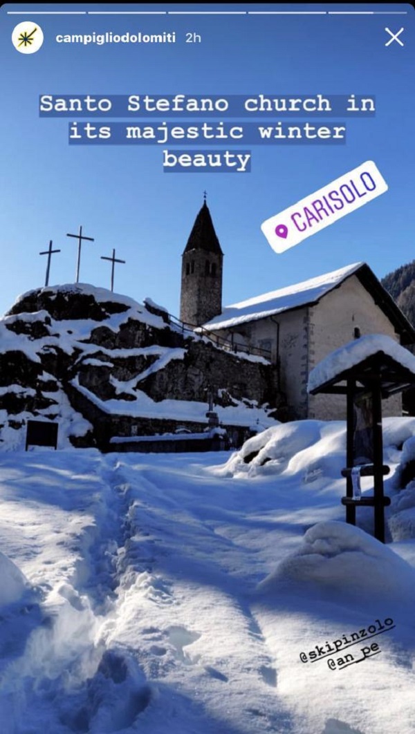 Dopo i disagi dell’ultimo fine settimana, l’abbondante nevicata di venerdi sta regalando a tutti, paesani e turisti, uno spettacolo di eccezionale bellezza. Le piste da sci sono fantastiche, il sole splendente, le cime innevate una favola. Anche nel fondovalle il paesaggio e’ finalmente invernale: mezzo metro di neve fresca a Pinzolo e piu’ di un metro al Doss. Molte e bellissime le immagini postate sui social dall’Apt e dalle Funivie Pinzolo e Campiglio. Eccone una della chiesetta di Santo Stefano :