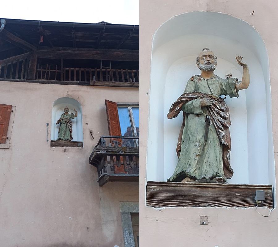 La bella statua di San Pietro che si trova in una piccola nicchia della facciata di un vecchio edificio di proprietà di Leonello Frizzi a Giustino, appena sopra la piazza centrale, avrebbe bisogno di un intervento di restauro per riportarla alla bellezza originaria. Ricordiamo che San Pietro è il Santo Patrono di Giustino, insieme a Santa Lucia, e ogni anno la sagra si tiene il sabato e domenica a cavallo di giugno e luglio.
