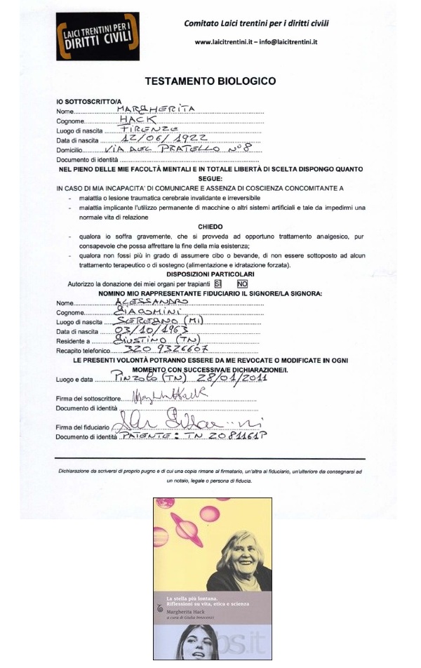 All’interno del libro è visualizzato, l’autentico , testamento biologico di Margherita Hack dove si evince la sede,cioè Pinzolo.