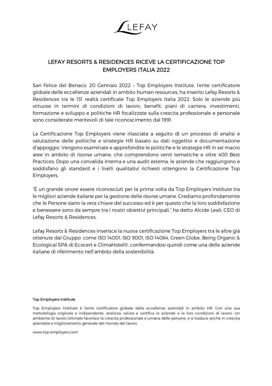 • Lefay Resorts – Certificazione Top Employers Italia 2022