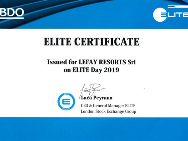 Lefay Resorts, entrata nel programma ELITE nel gennaio 2018 tramite il partner BDO, ha ottenuto la certificazione in poco più di un anno. «Sin dalla sua nascita, Lefay Resorts è stata orientata ad una cultura d’impresa innovativa e a un modello di business sostenibile e trasparente verso i nostri stakeholder. La certificazione ELITE rappresenta un importante traguardo in questo percorso permettendo al nostro Gruppo di rafforzare la propria visibilità verso la comunità finanziaria e dando un ulteriore impulso alla nostra strategia di crescita,» afferma Massimiliano Leali, Chief Financial Officer di Lefay Resorts.