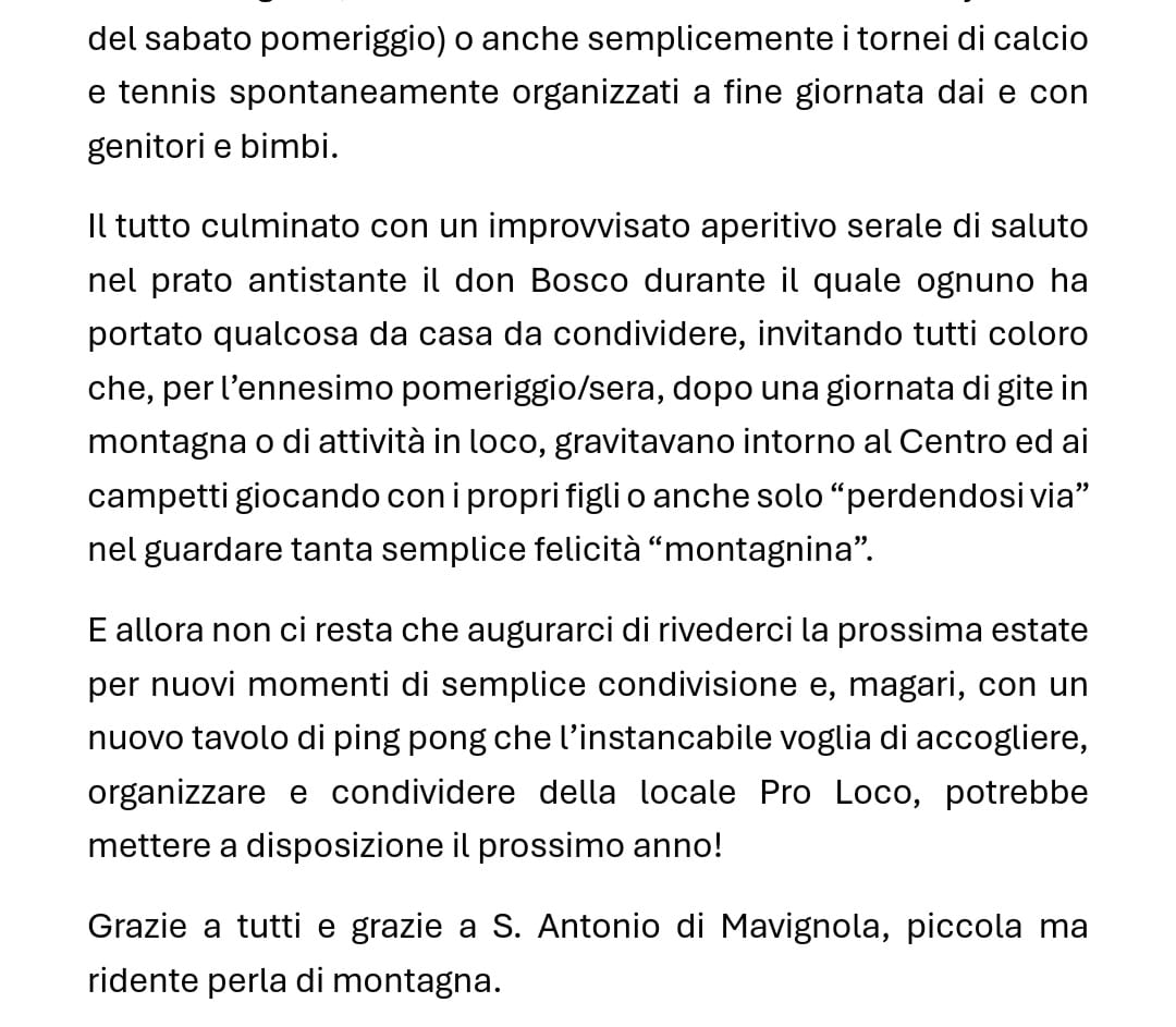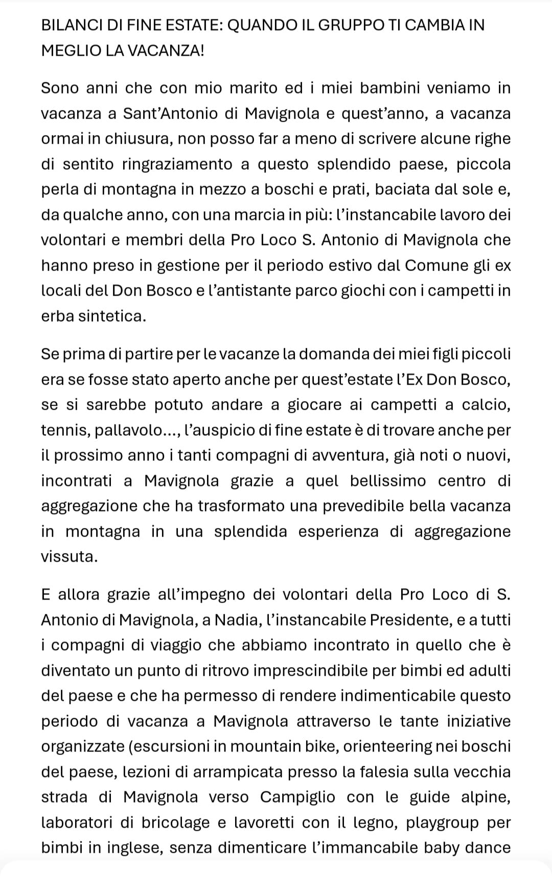 • Lettera di ringraziamento di un gruppo di turisti felici a Mavignola