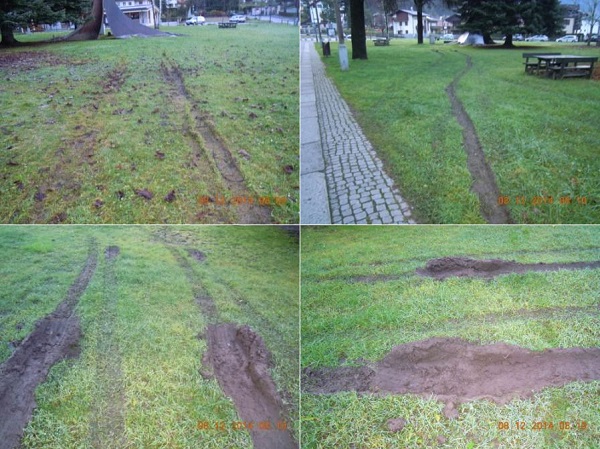 Nel parco della biblioteca, un angolo veramente bello di Pinzolo, da qualche tempo si vedono carreggiate profonde di automezzi pesanti, con direzioni incomprensibili e non si capisce se siano oggetto di vandalismi oppure di lavori eseguiti e terminati senza il ripristino del manto erboso.
