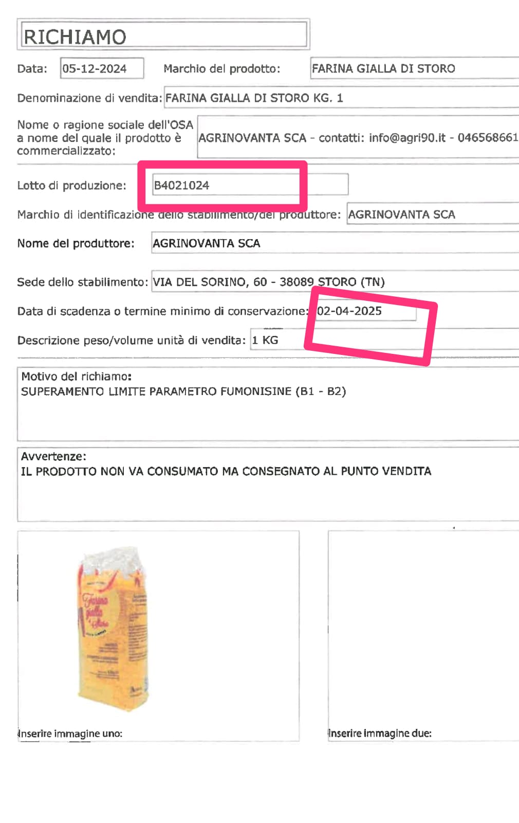 Lotto di farina gialla di Storo ritirata dal mercato per rischio chimico.