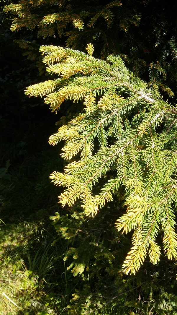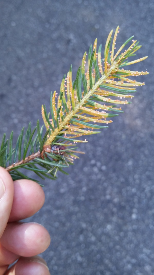 Nei giorni scorsi ho percorso la strada che da Patascoss porta a malga Ritort ed mi sono accorto che tutti gli abeti presentavano i getti dell’anno di coloro giallastro. Lo stesso fenomeno l’ho poi verificato nel bosco di abeti che va da malga Grual verso malga Cioca, sempre a una quota intorno ai 1700-1800 metri. Contattando qualche esperto forestale ho scoperto che, con tutta probabilità, si tratta di un attacco massiccio di Chrysomyxa ledi var. rhododendri, che causa la malattia denominata “ruggine vescicolosa degli aghi dell’abete rosso“. Purtroppo non c’è nulla da fare ma il danno può essere consistente, specie negli esemplari giovani. Generalmente gli aghi infetti cadono a terra lasciando l’ultimo internodo del rametto spoglio. Pare che gli attacchi siano più gravi nelle zone umide dove sono presenti specie di rododendri, ospiti secondari del patogeno.