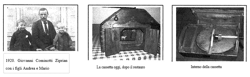 La cassa con i suoi meccanismi e tutte le statuine fatte a mano, fu costruita da Giacomo Caola Stampun, falegname di Pinzolo. Per generazioni i Stampun hanno esercitato l’arte del “marangun”; ancora oggi due di essi, Andrea e Rino, sono falegnami. La sua famiglia era numerosa, composta da marito e moglie e otto figli, sei maschi e due bambine. Una sorella, Adele, si era maritata con Giovanni Cominotti Ziprian e aveva dato alla luce due bambini, Andrea (1915) e Mario (1919).