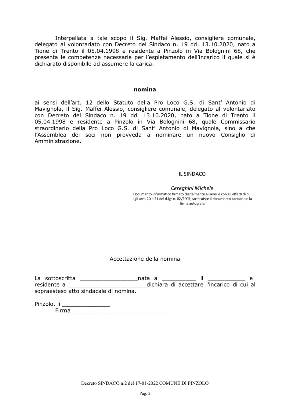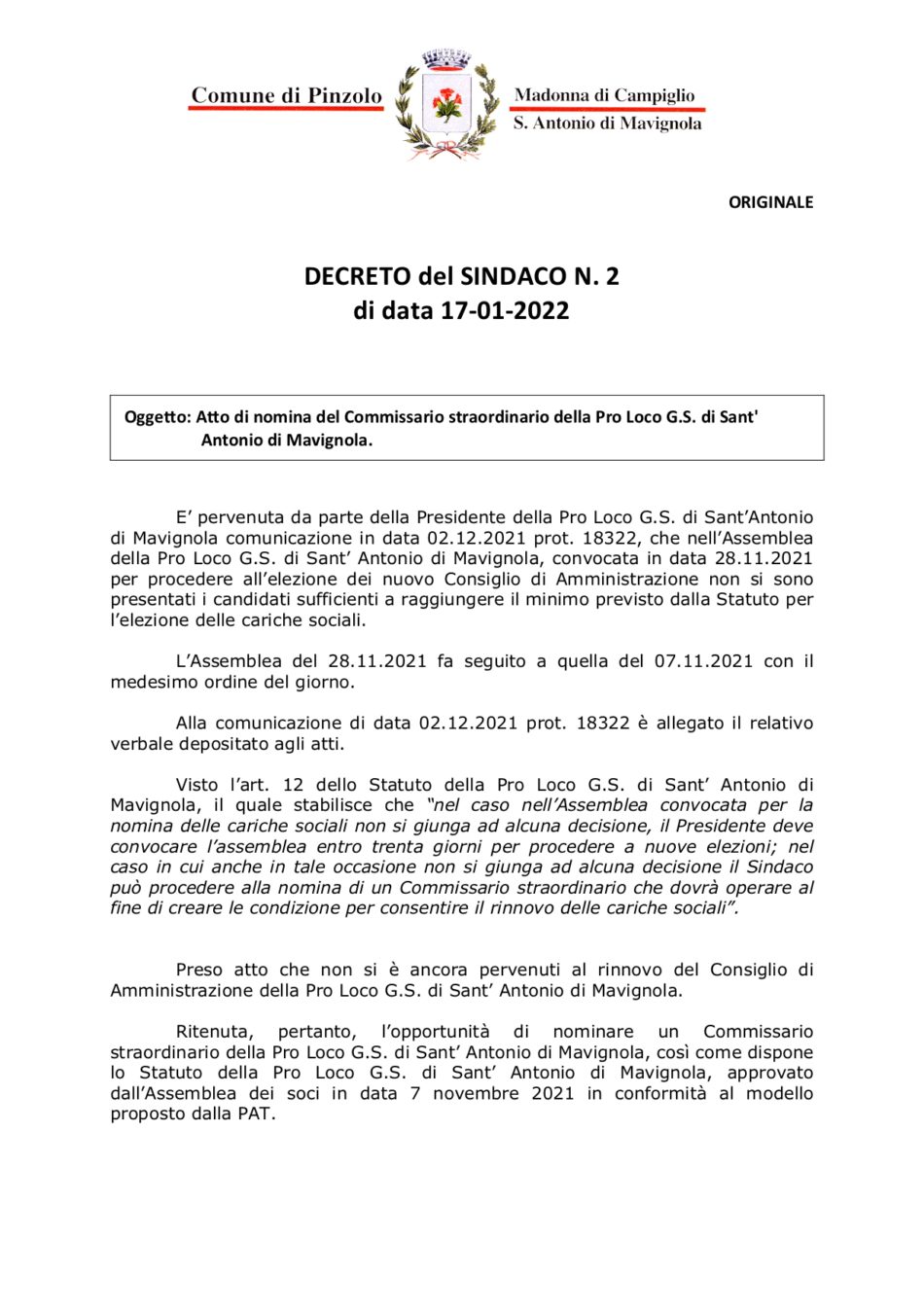 • Nominato il Commissario straordinario della Pro Loco G.S. di Sant’ Antonio di Mavignola