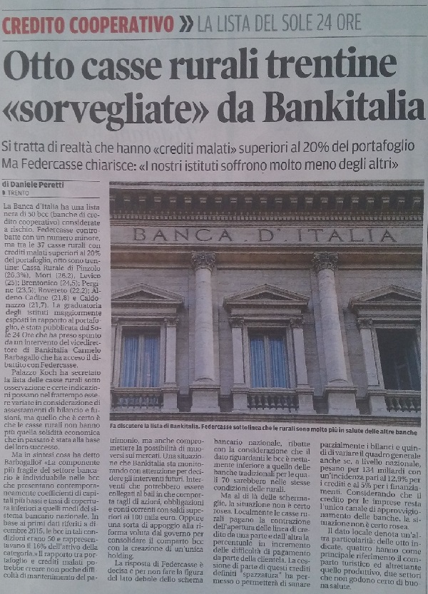 • Otto casse rurali trentine sorvegliate da Bankitalia
