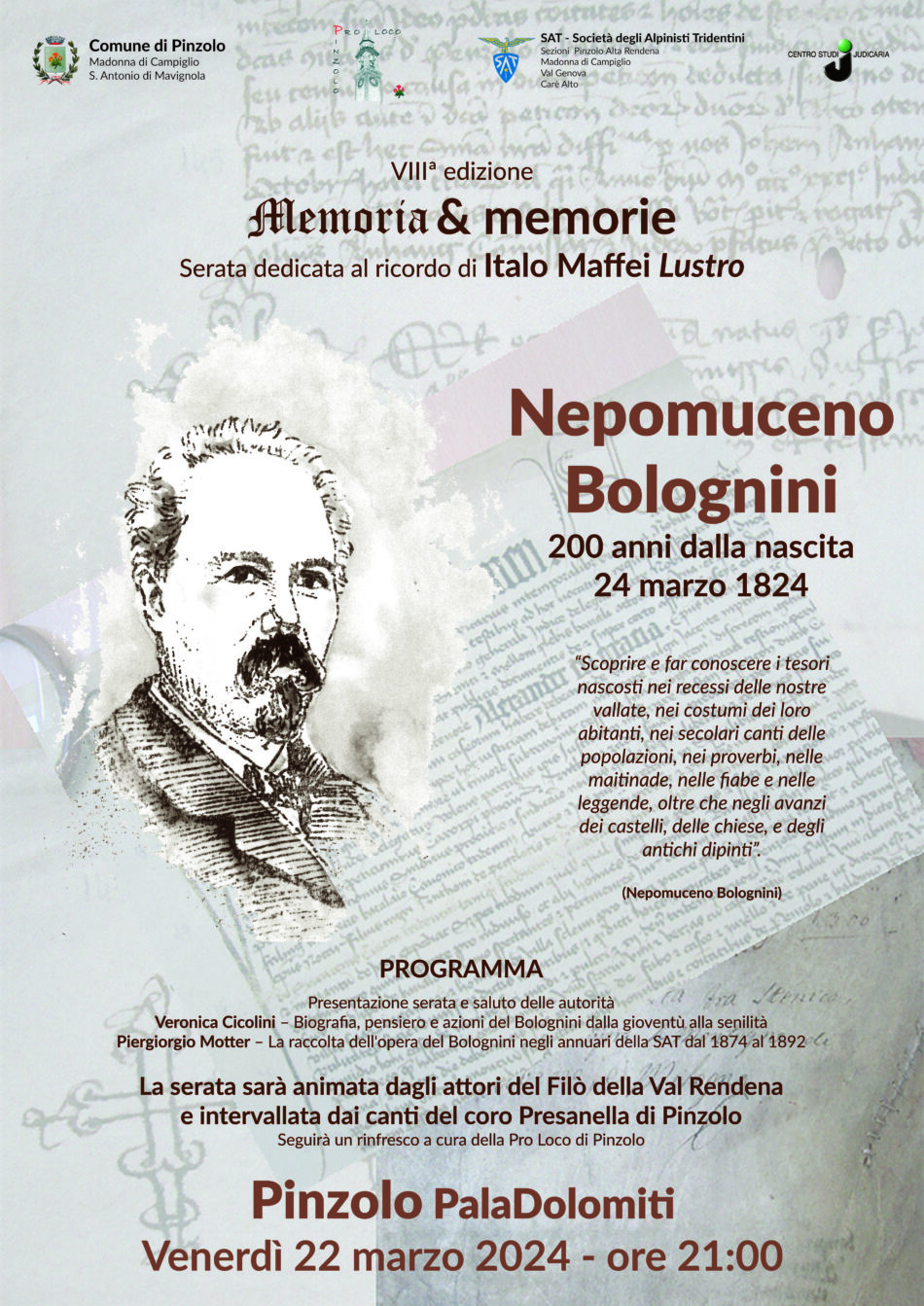 E proprio per favorire la conoscenza di questo nostro illustre concittadino, il 22 marzo alle ore 21.00 presso il PalaDolomiti di Pinzolo, è stata organizzata una piacevole serata in cui le relazioni di Veronica Cicolini sulla biografia del Bolognini e di Piergiorgio Motter sugli scritti, verranno intercalate con gli interventi del Coro Presanella e dagli attori del Filò da la Val Rendena.