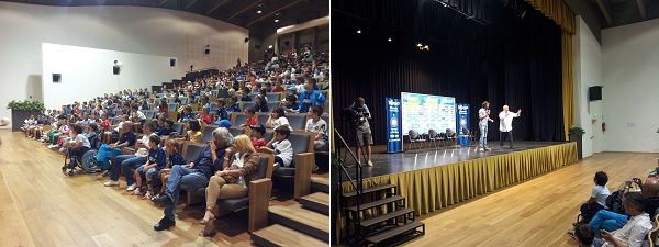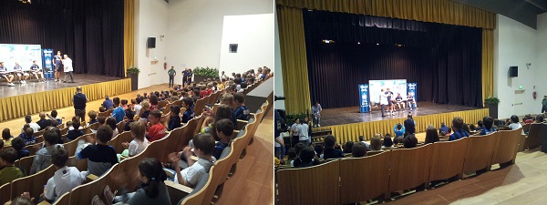 E’ stata una serata davvero emozionante quella di stasera al PalaDolomiti. Quasi cinquecento piccoli tifosi in delirio per i loro idoli nerazzurri. Quattro campioni dell’Inter, Longo, Capello, Alvarez e Cambiasso, hanno salutato i loro piccoli sostenitori, prestandosi per foto di gruppo e autografi. La serata, che ha visto la presenza discreta del sindaco William Bonomi e dell’assessore al turismo Anita Binelli, è stata interamente riservata agli Under 12. Ottima, infatti, la scelta di permettere l’ingresso ai soli bambini, mentre i genitori hanno atteso i loro figli all’esterno del PalaDolomiti. I bambini, aizzati dai due conduttori della serata, si sono scatenati in cori da stadio davvero emozionanti: immaginatevi la potenza sonora di 450 bambini che urlano il nome di Milito !!!