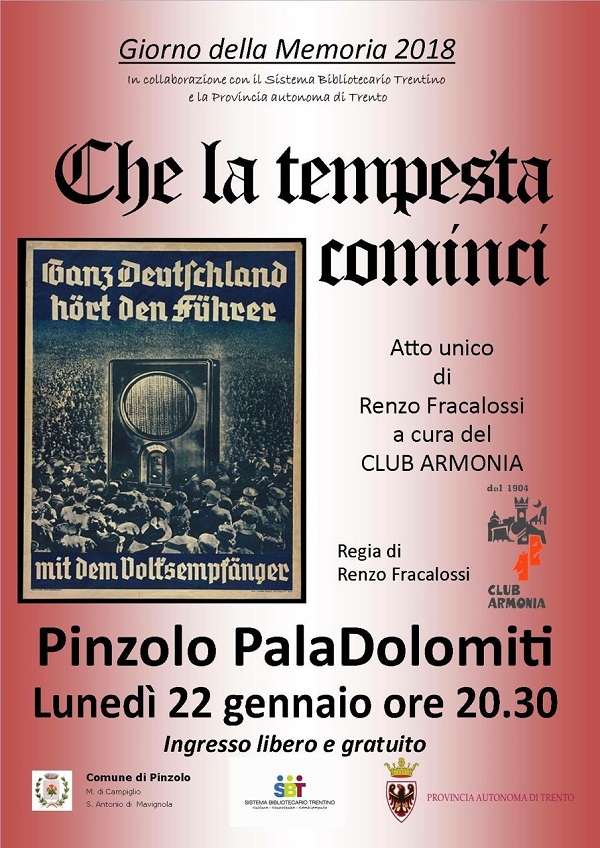 In occasione della Giornata della Memoria, che ricorre ogni anno il 27 gennaio, con il supporto del Sistema Bibliotecario Trentino, della Provincia Autonoma di Trento e con la regia di Renzo Fracalossi, il Club Armonia sta portando in scena nei teatri comunali trentini questa sua nuova produzione. Lo spettacolo, raccontando l’episodio della volontaria diffusione di quella che oggi verrebbe definita una “fake news”, una notizia fasulla, rivela il ruolo che la propaganda e i mass media hanno avuto nel piegare le coscienze del popolo tedesco, favorendo l’ascesa del Nazismo.