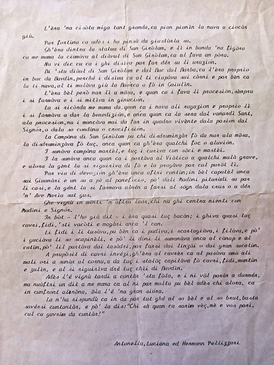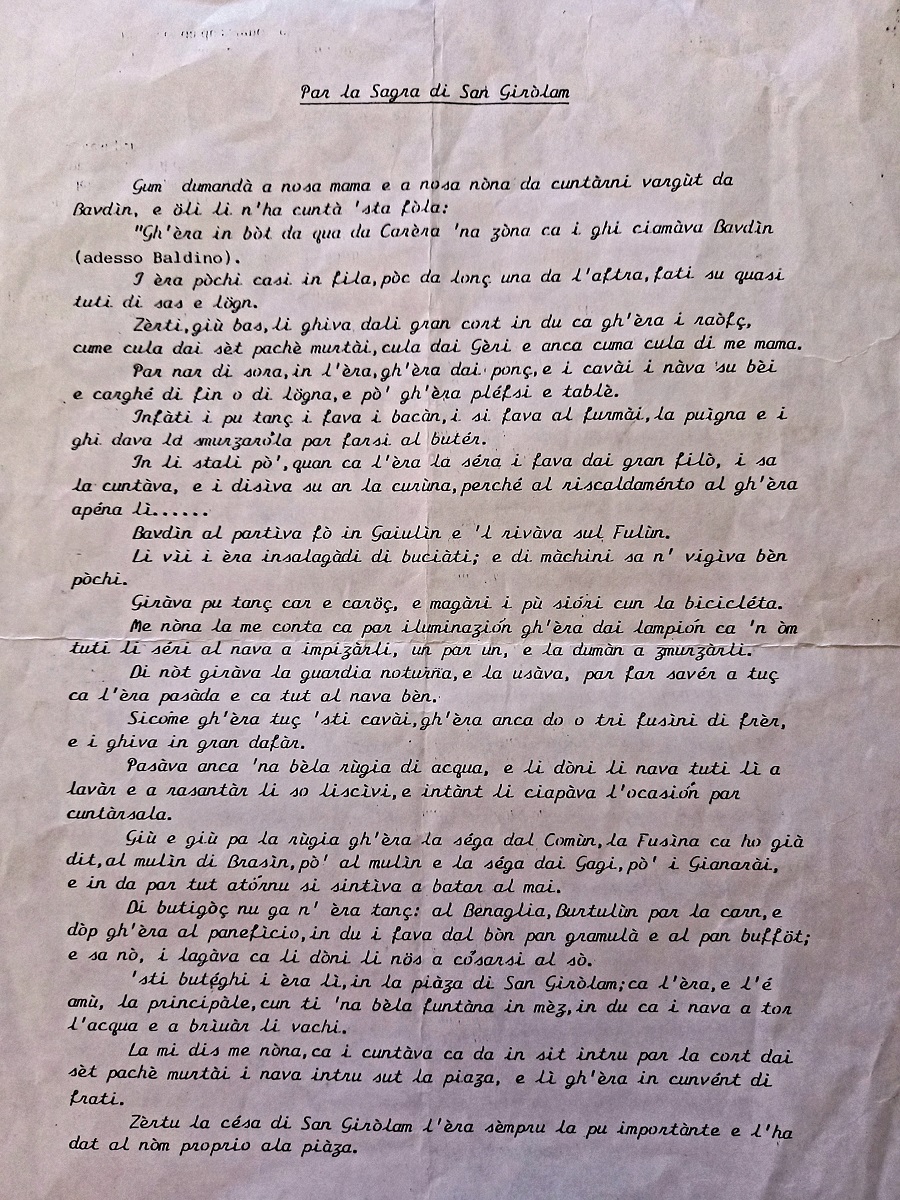 Si tratta di un compito assegnato ai miei figli Antonella, Luciana e Hermann, al tempo delle scuole elementari in occasione della festa di San Girolamo; consisteva nell’intervistare i nonni in merito agli usi e costumi del Baldino di allora.