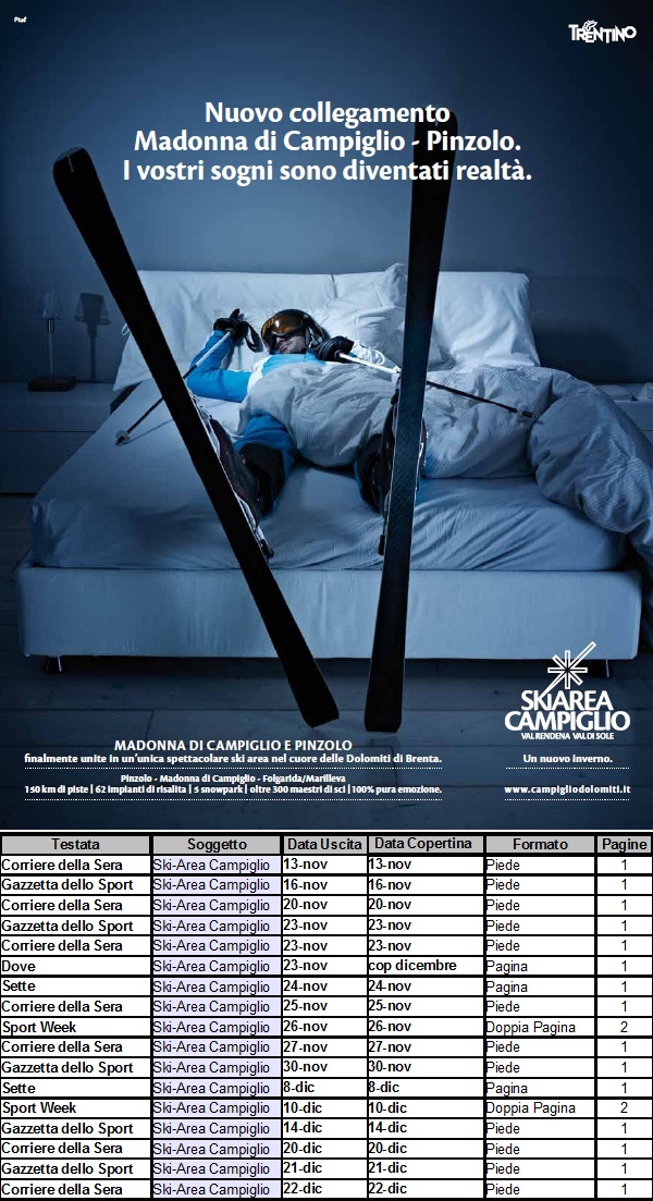 A partire da domenica 13 novembre 2011 avrà inizio la campagna stampa realizzata dall’Azienda per il Turismo in collaborazione con Trentino Marketing dedicata al lancio della nuova skiarea Pinzolo-Campiglio.